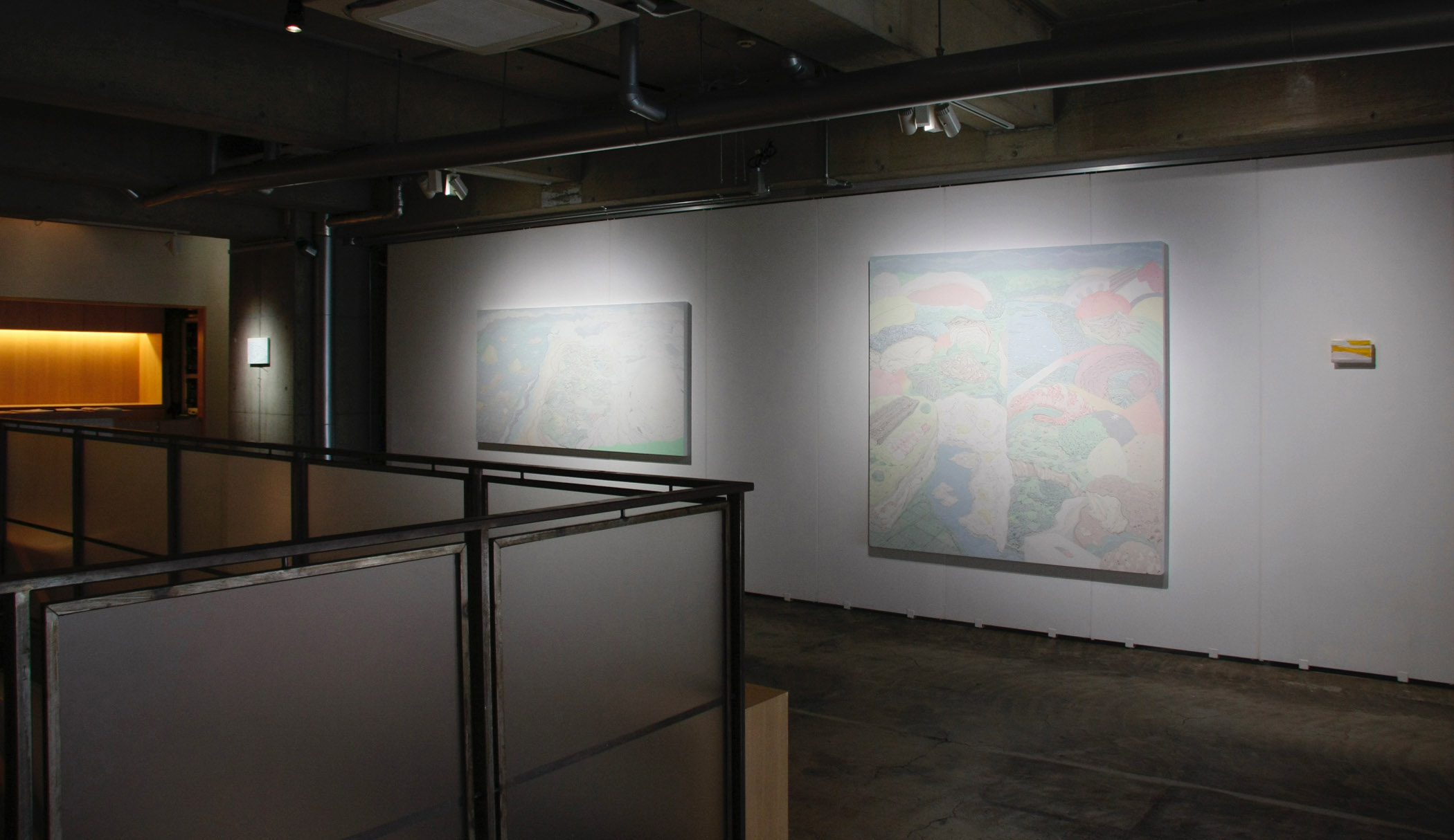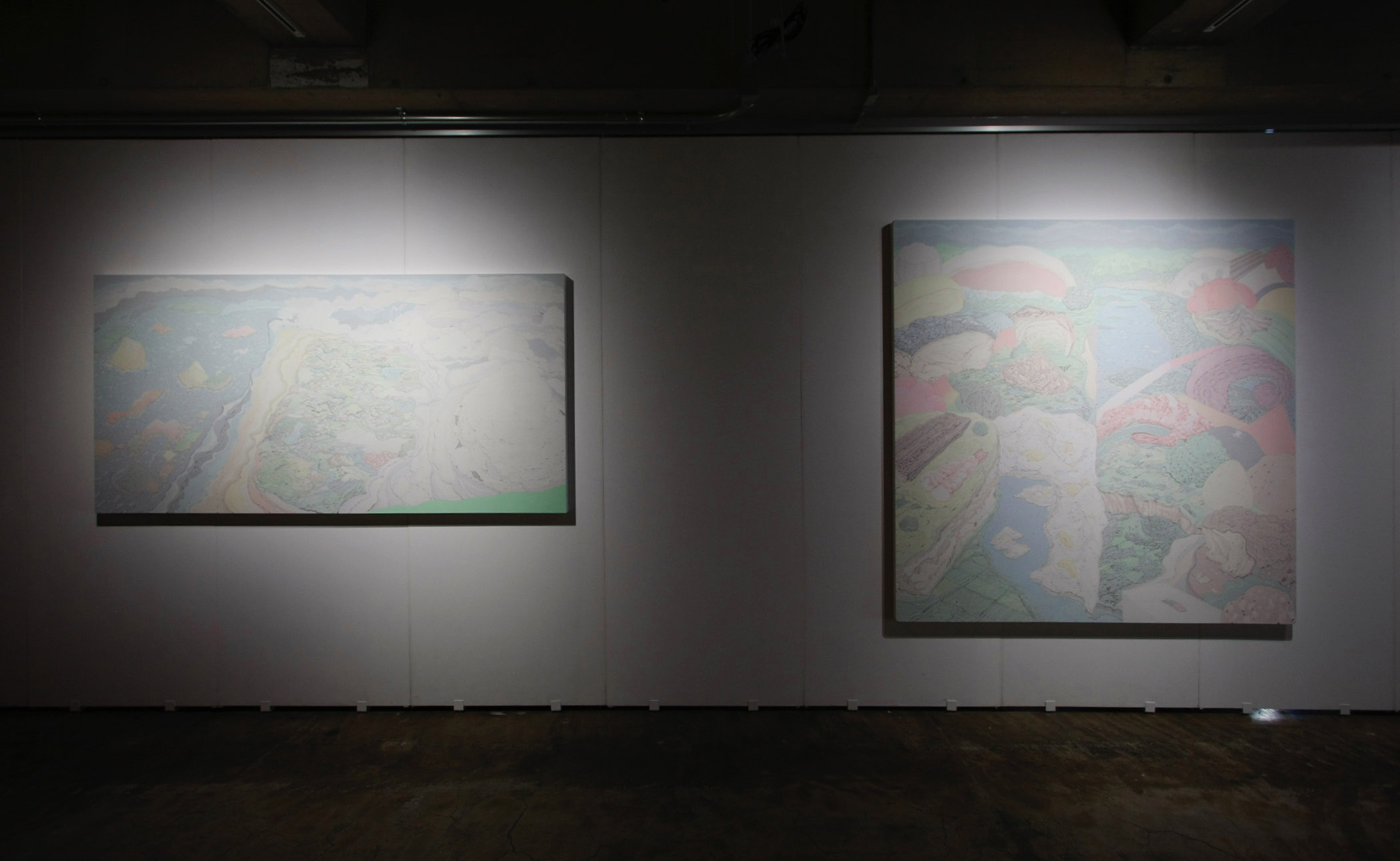 また、作品全体の淡い色彩は、パネルにアクリル絵具によって鮮やかな色面で描かれた画面を薄い綿布で覆うことで生じています。これによって絵具の物質感や本来の色彩を曖昧にし、その上から鉛筆で色の輪郭を捉え、山の稜線をなぞるように自由な線を加えていきます。この二重構造ともいえる独自の手法は、目に見える(見えた)であろう「ありのままの情景」を、自由な想像による「イメージの世界」に変換させるもので、これによって鑑賞者は、「食べ物」といった身近で小さな世界と、「風景」といった大きなスケールの世界を軽快に行き来するかのような視覚体験が出来るのではないでしょうか。
