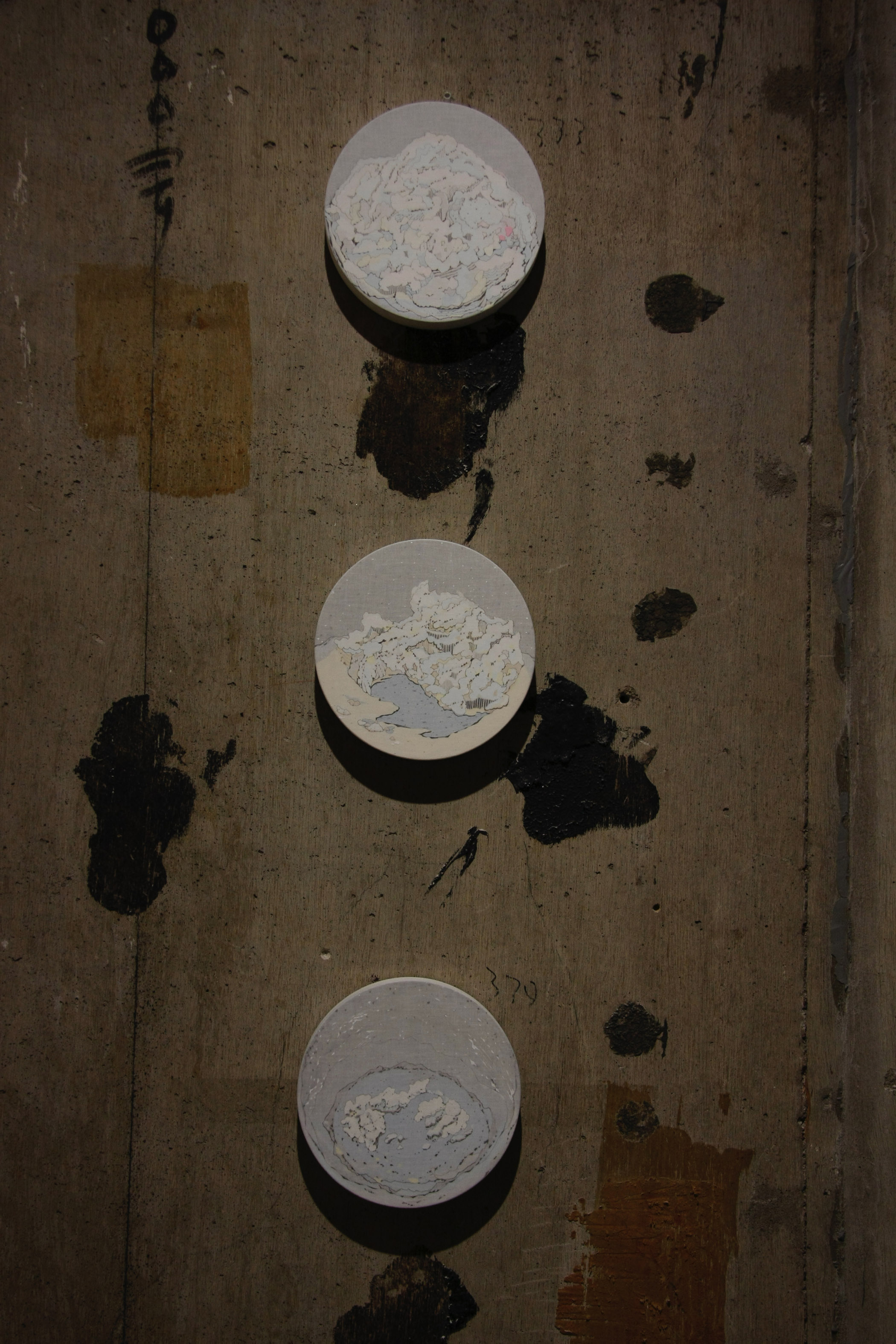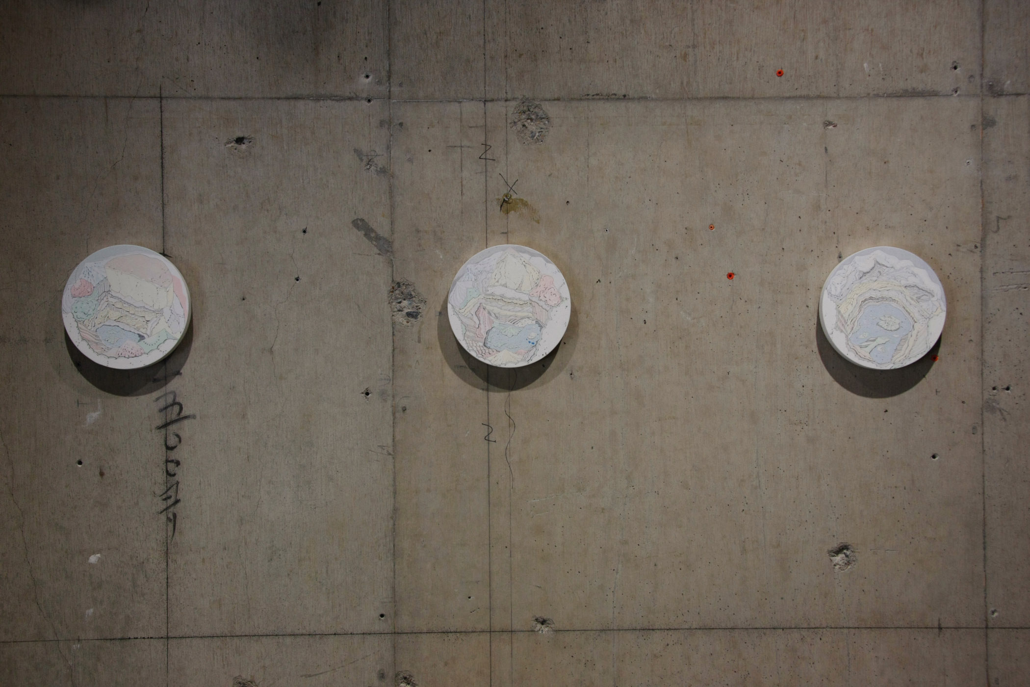 例えば瓜生は日々おこなわれる食事にあって、スプーンやフォークによって「食べ進める」という当たり前の行為の中から、そこに「山や谷のある情景」を見出し、その形を捉えます。このように瓜生の絵画制作は、自身が実際に「見える」情景を起点としてはじまります。雄大な風景の鳥瞰図のようにも見えるその絵画は、瓜生がお皿を覗き見る視点であり、望遠鏡や顕微鏡で異なる世界を覗くような不思議な視覚感覚を呼び起こします。